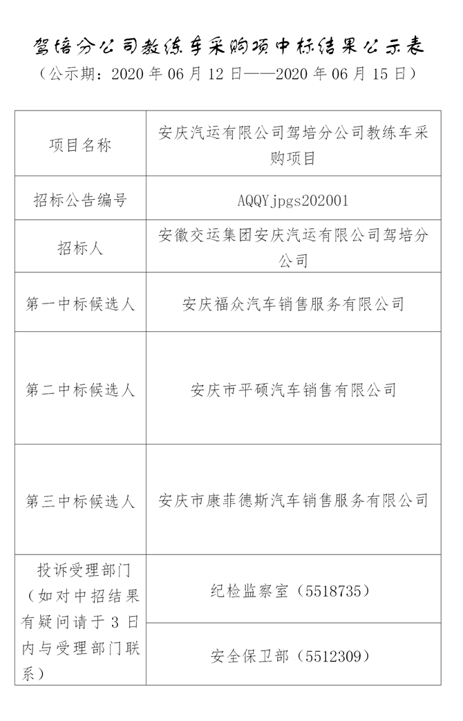 駕培分公司教練車采購項(xiàng)中標(biāo)結(jié)果公示表