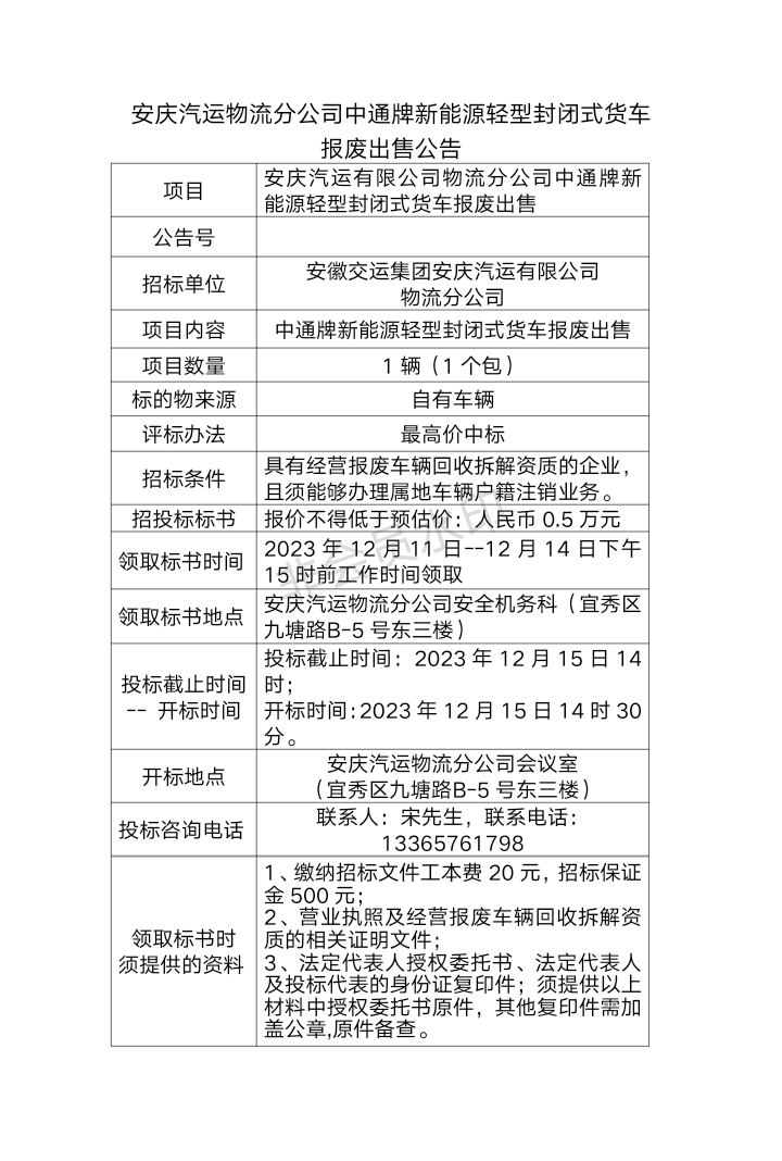 安慶汽運(yùn)物流分公司中通牌新能源輕型封閉式貨車(chē) 報(bào)廢出售公告