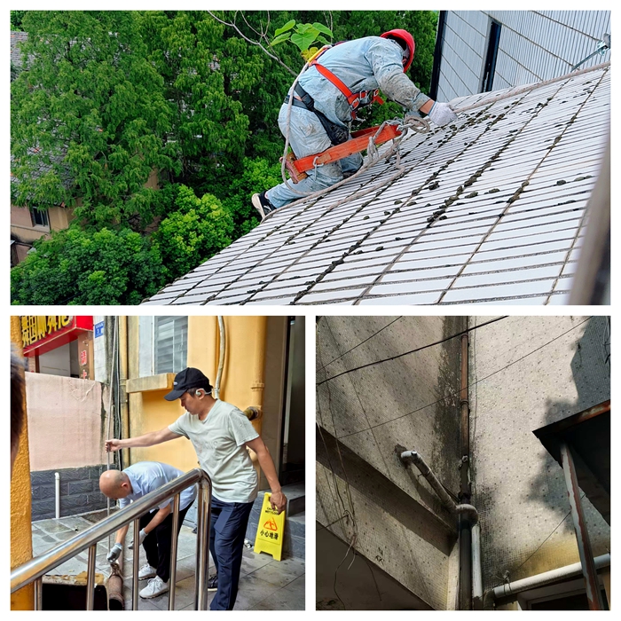8月安全巡查期間,綜合服務(wù)中心安全科針對紡織南路7號樓及周邊區(qū)域開展專項隱患排查,發(fā)現(xiàn)兩處亟待處理的安全問題:一是7號樓公廁外側(cè)落水管多處破裂,導(dǎo)致雨水滲漏至路面并形成大面積積水,不僅影響市容環(huán)境,更對過往車輛及行人構(gòu)成潛在風險;二是慶達綜合樓頂層臨街面瓷磚多處開裂,縫隙中滋生的灌木根系已侵入建筑結(jié)構(gòu),存在高空墜物隱患,嚴重威脅公共安全。