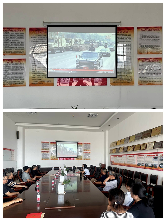 上午9時50分,全體與會同志已整齊就座,懷著無比激動和期待的心情等待儀式開始,10時整,閱兵儀式正式開始。整個收看過程,會場秩序井然,氣氛莊重熱烈。同志們全程凝神屏息,認真觀看每一個環(huán)節(jié):迎賓儀式、閱兵式、分列式、空中梯隊、群眾游行等。