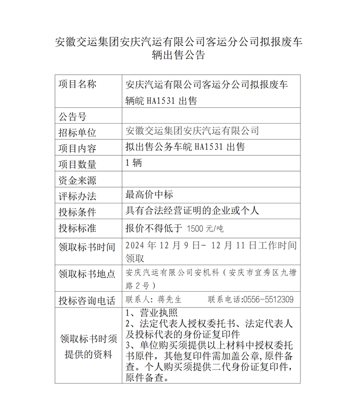 安慶汽運(yùn)有限公司客運(yùn)分公司擬報(bào)廢車(chē)輛出售公告